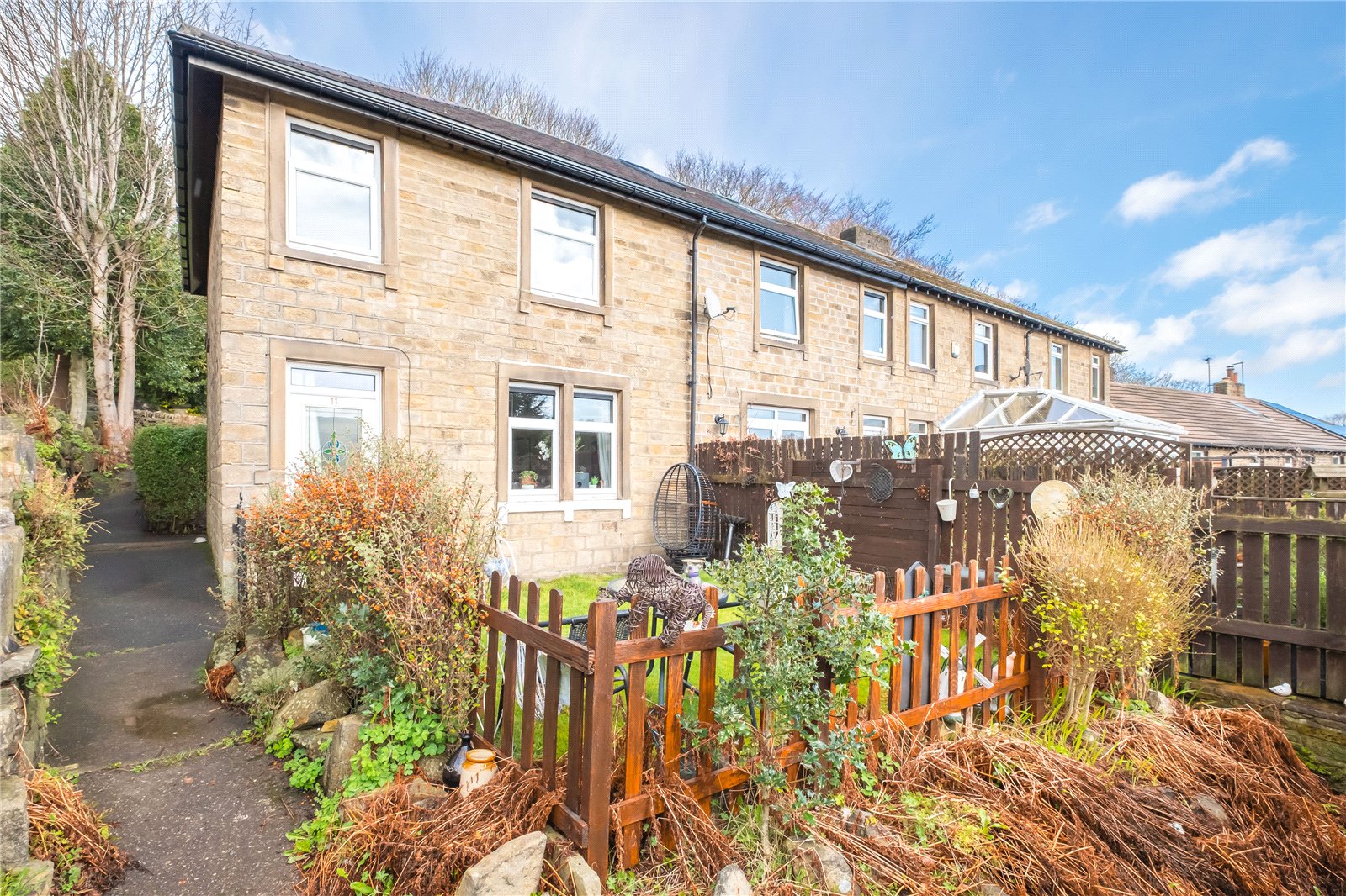 Enjoying a superb location which is just a short walk from the centre of Holmfirth, this stone built end terraced property has generous gardens and exceptional views. It comprises: entrance hall, lounge, dining kitchen, pantry, landing, 3 bedrooms and bathroom. Whilst it has been re-roofed in 2025 and has uPVC double glazing, we expect that the new owner will need to carry out some renovation work including rewiring and the installation of central heating. Externally, there are pleasant gardens to the front and rear along with an additional allotment plot beyond. For sale with no upper chain.