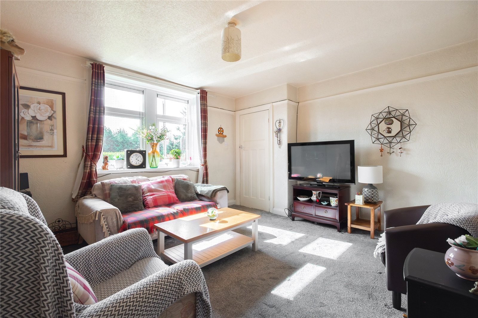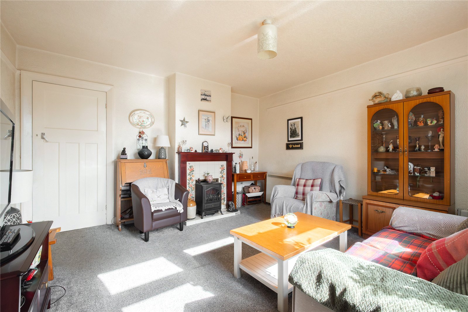 A good sized living room with window to the front enjoying the views, chimney breast with feature fireplace and electric heater.