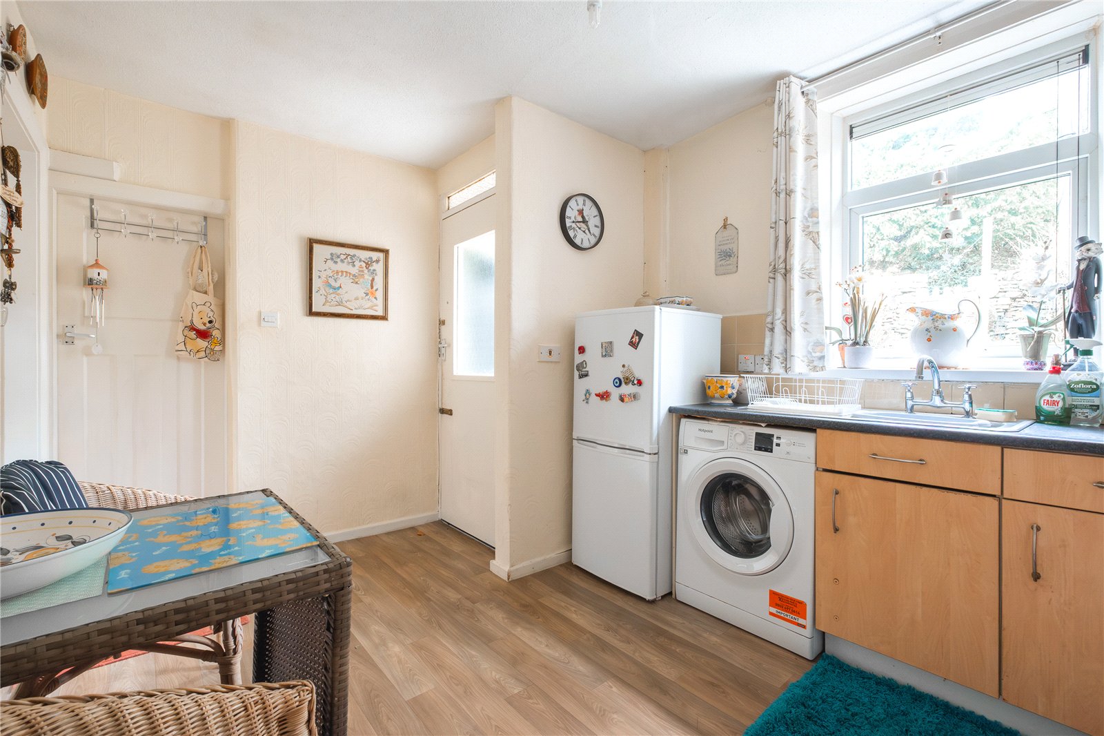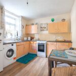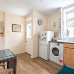 Fitted with a basic range of fitted units with laminated worksurfaces, plumbing for a washing machine, stainless steel sink, free standing cooker, built in electric heater, window to the rear and pantry cupboard.
