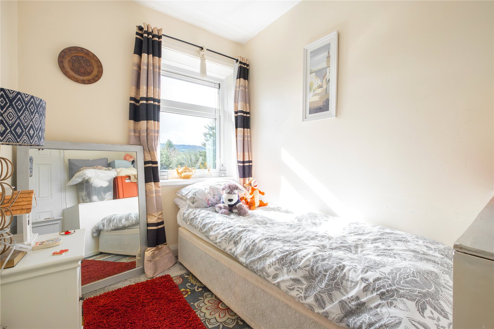 A single bedroom with window to the front enjoying the views and electric heater.