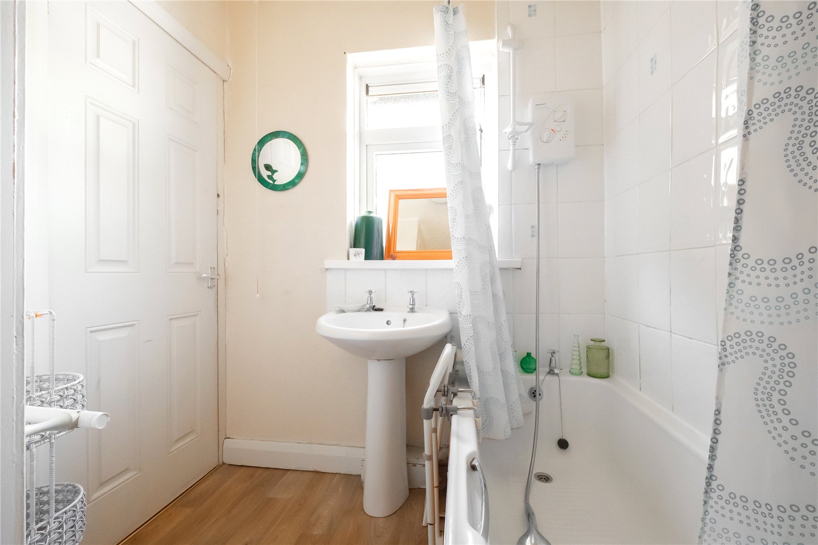 With low flush wc, pedestal washbasin and bath with shower over, airing cupboard and obscure glazed window to the side.