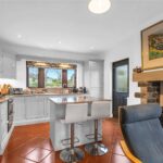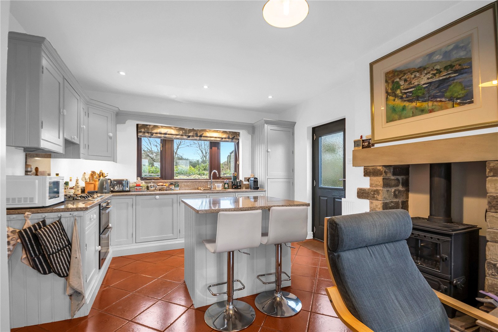 A good sized open plan living / dining kitchen which spans from front to rear of the building, featuring windows to the front, glazed double doors and windows to the rear, taking full advantage of the views. It is fitted with a good range of base units and wall cupboards with granite worksurfaces and matching island unit, 1 ½ bowl stainless steel sink with mixer tap, integrated dishwasher, double oven and 4 ring gas hob with extractor over. There is a chimney breast with feature stone fireplace and log burning stove, quarry tiled floor and 2 central heating radiators.