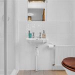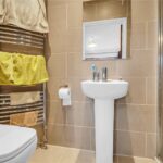With three piece suite comprising low flush wc, pedestal washbasin and shower enclosure, fully tiled walls, heated towel rail, inset spotlights to the ceiling and central heating radiator.