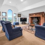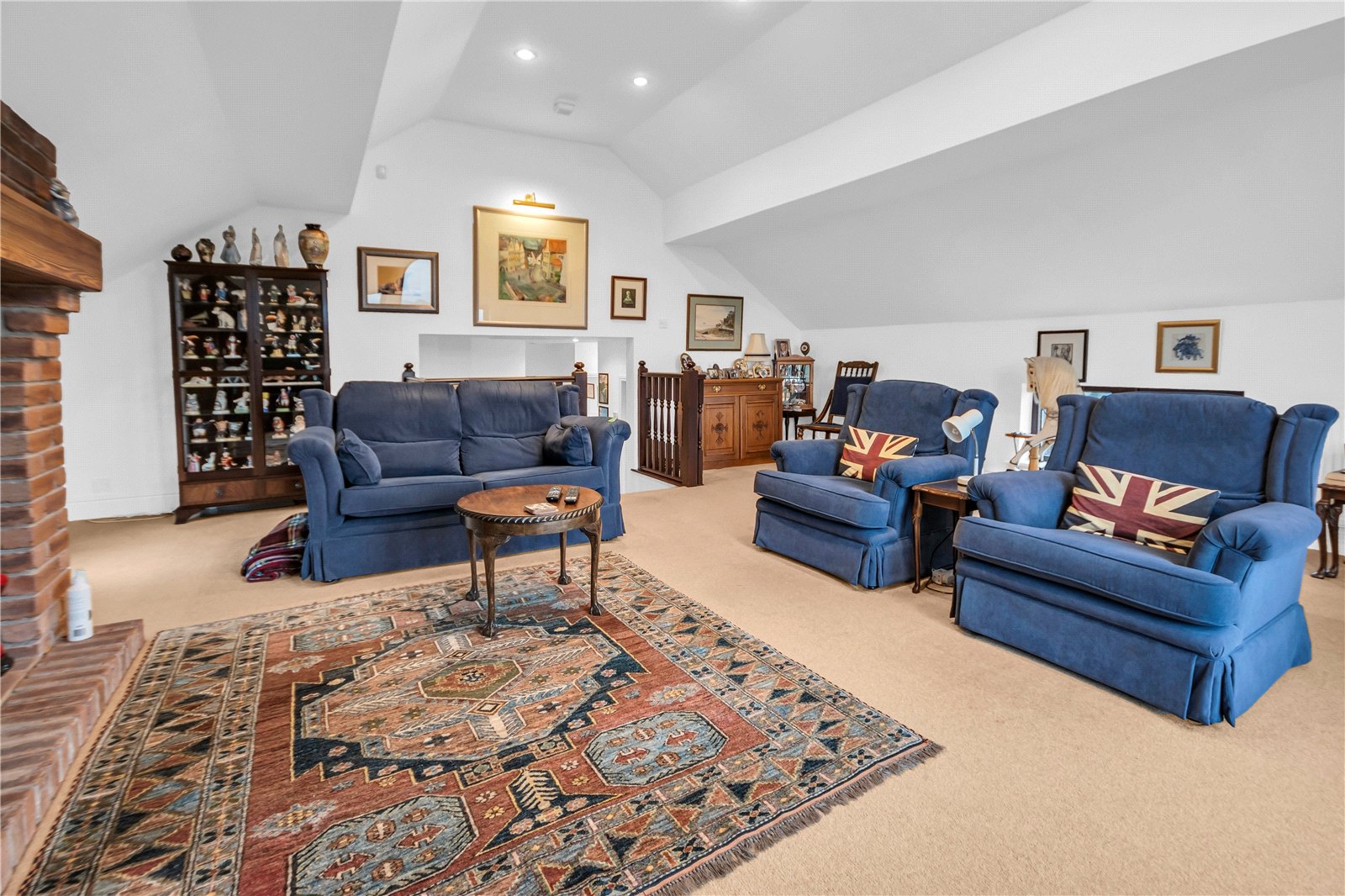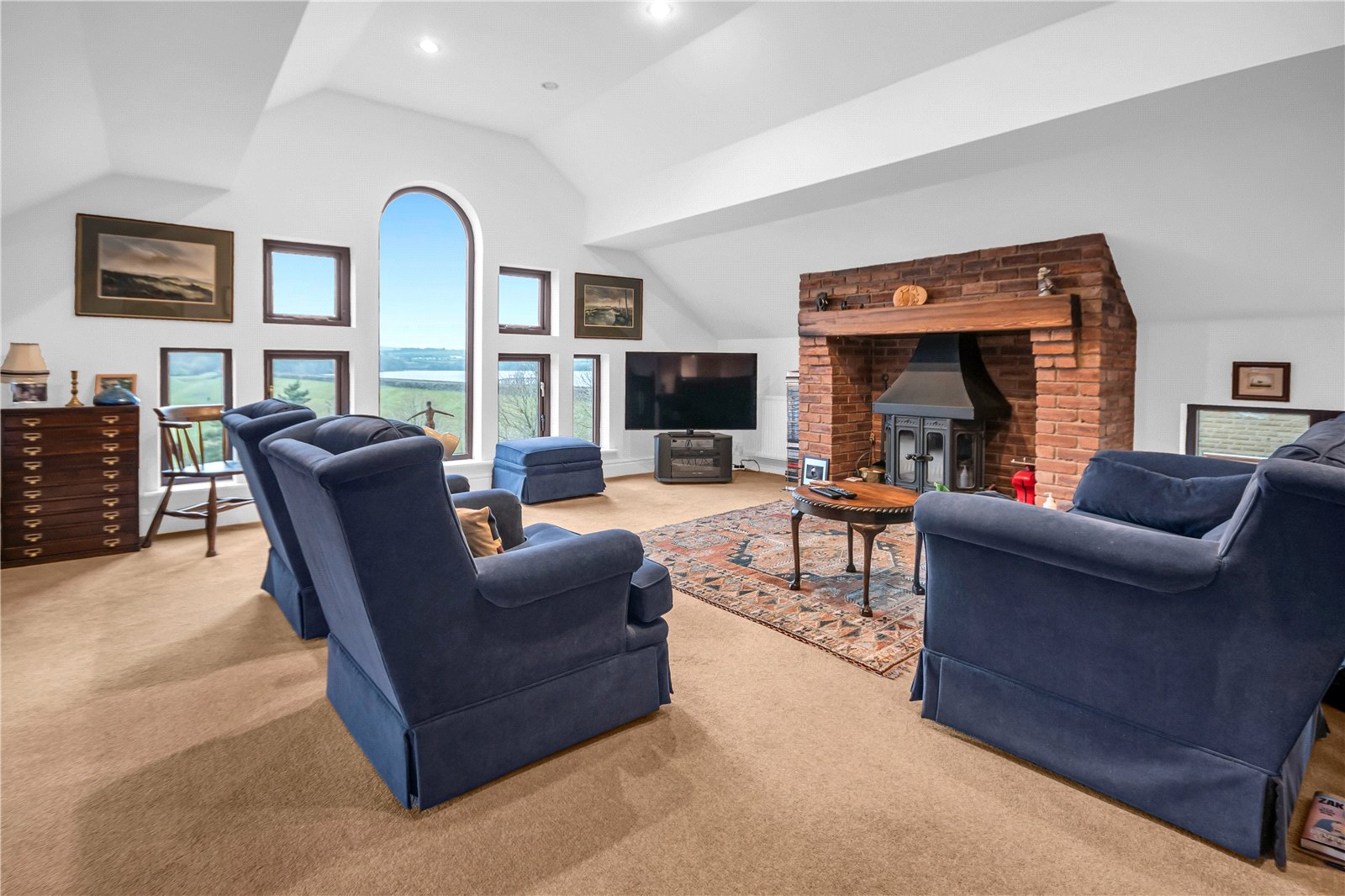 A large living room located up a short set of steps from the hall, with feature windows to the rear enjoying the views and further windows to either side, feature brickwork fireplace with living flame effect gas fire, inset spotlights to the part angled ceiling, 3 central heating radiators.