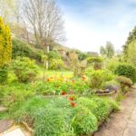 The gardens wrap around the side and rear of the building and feature generous paved seating areas with a lawn and borders beyond.