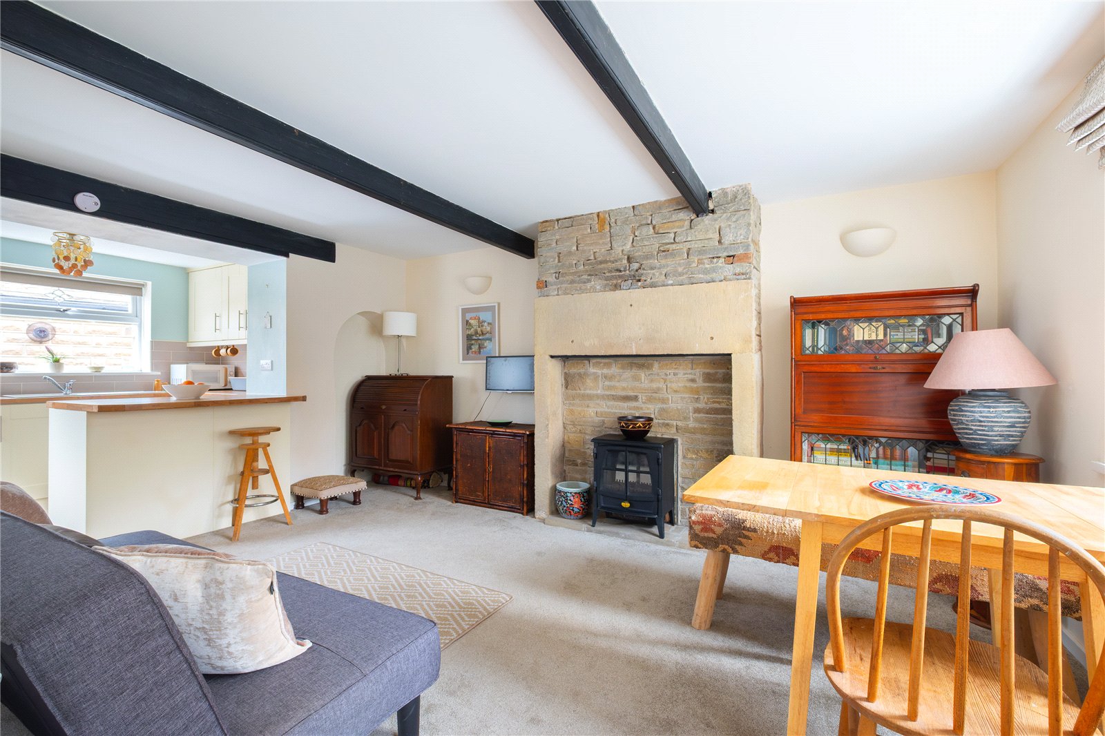 Entrance is gained to the front of the property courtesy of a double-glazed front access door, which opens to the charming living space. Here there are exposed beams to the ceiling and exposed stonework to the chimney. Set up on a raised stone hearth is a fire effect electric stove. In the lounge area there are two central heating radiators, double-glazed bow window to the front, and a useful under the stairs storage area, which drops down three steps offering storage, the electricity fuse board and is home to the property’s gas fired central heating boiler.