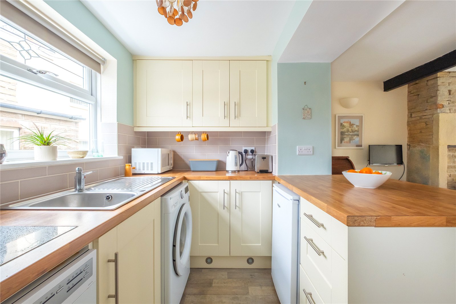 Open to the lounge and benefiting from a good-sized breakfast bar worktop area, the kitchen has plumbing for an automatic washing machine, a stainless-steel sink unit with mixer tap over, electric hob, space for an undercounter fridge and double-glazed window allowing rear aspect views. The owners have replaced the original gas hob and gas oven that were previously installed, so there are both gas and electric connections in place should the new owner wish to reinstall similar appliances. There is an extractor hood, a rear side access double-glazed door, relevant tiled splashbacks and units to the high and low level.