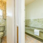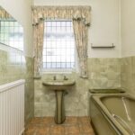 With pedestal washbasin and bath in green, partly tiled walls, built in airing cupboard and obscure glazed window to the side.