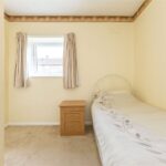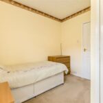 A small double or very generous single bedroom with bulkhead storage cupboard and window overlooking the front garden.