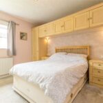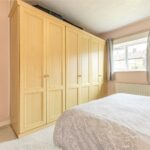 Fitted with a bank of wardrobes, bedside units, and bridging units above. There is a window overlooking the front garden.