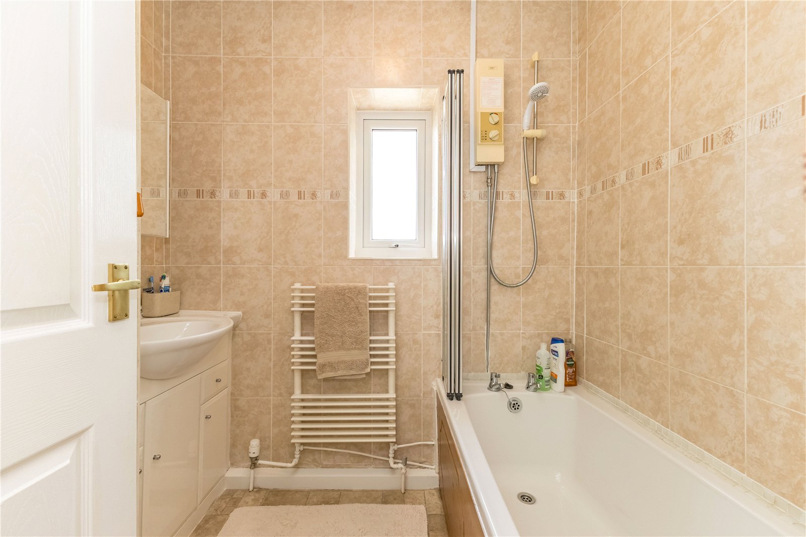 Fitted with a white suite comprising a panelled bath with shower and screen over, and a vanity wash basin with cupboard beneath. There are tiled walls, frosted window to the rear, and tile effect flooring.