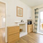 French doors open to give access out directly onto the decked sun terrace. There is access to a very useful under stairs storage cupboard, and a recess within the chimney breast has a painted timber surround and high-level cupboards to one side. An opening then leads through to:-