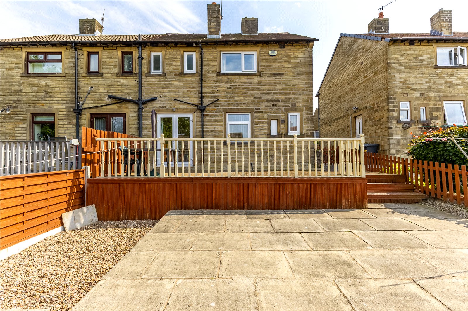 A path runs down the side of this and the neighbouring No.27 giving access to each property. The sizeable front garden is mainly lawned with flower beds and rockery borders all enclosed by timber fencing and hedging. At the rear you will find a large, decked sun terrace which is ideal for outside entertaining. Beyond this is a substantial mainly flagged garden with gravel borders, shrubs, and access to a timber shed. This is also enclosed by mainly timber fencing.
