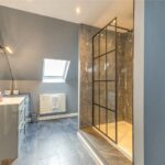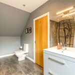 This spacious area has a sloping ceiling line, a Velux window, vanity basin with storage beneath and to the side, large walking front glazed and tiled shower area and a low-level flush WC. The room has a central heating radiator and inset spotlights to the ceiling.