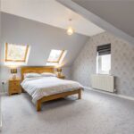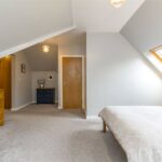 Another generous size double bedroom with a side window, two Velux windows, a central heating radiator and access through to the en-suite and wardrobe area. At this point there are deep under eave storage wardrobe areas to the left and the right before opening through to the en-suite. There is a small section that has restricted head height (shaded grey on the plan).