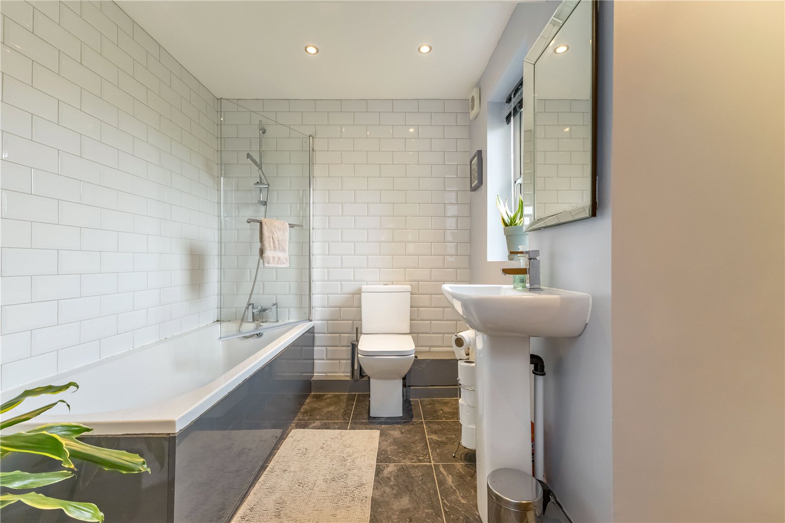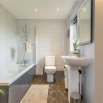 The bathroom comprises of a three-piece suite in white with a low-level flush WC, pedestal hand wash basin and bath with shower attachment. The bathroom has an obscure glazed window, extractor fan, inset spotlights to the ceiling and a central heating radiator.