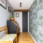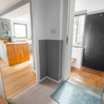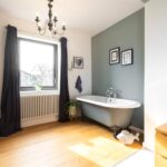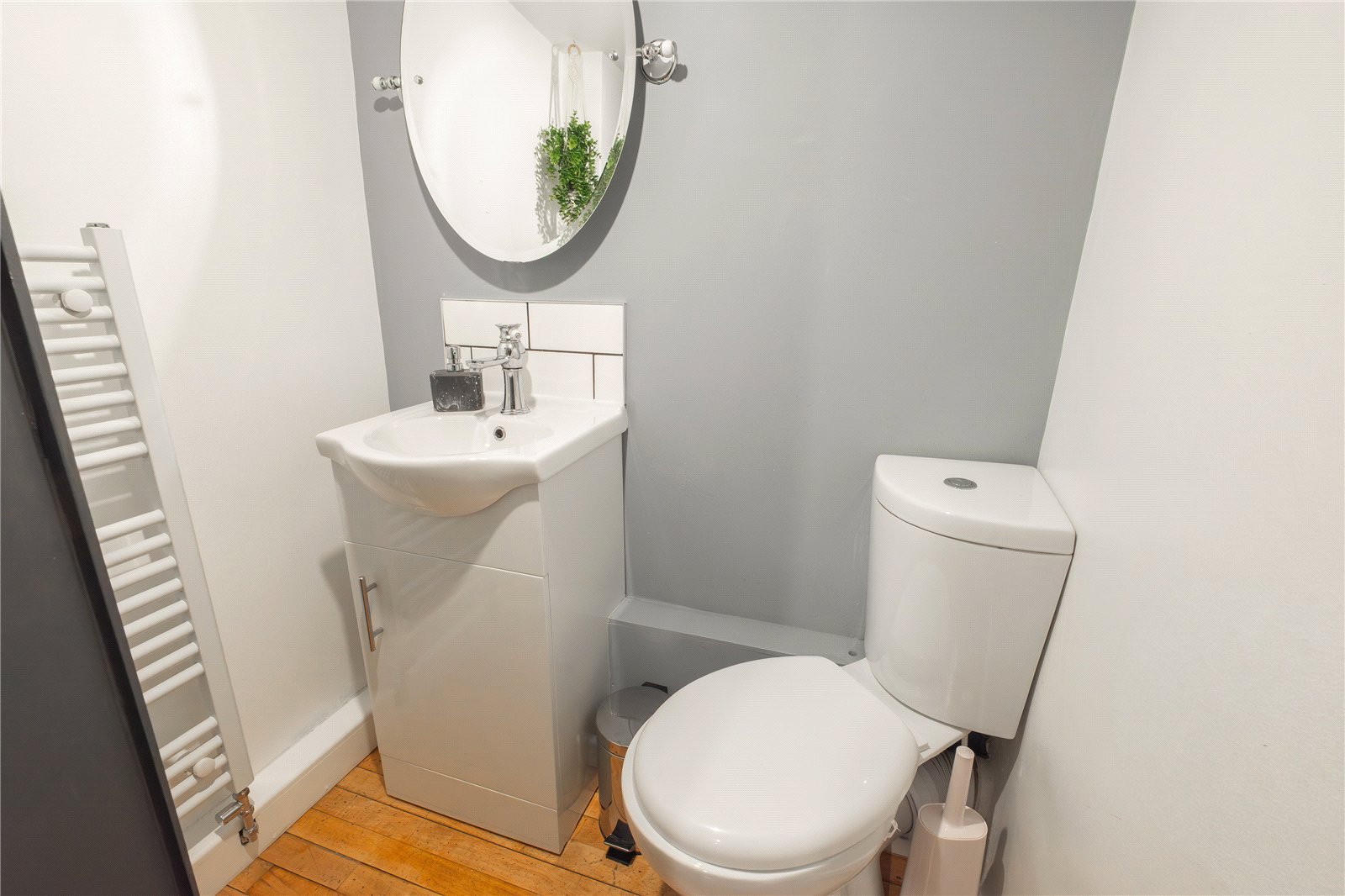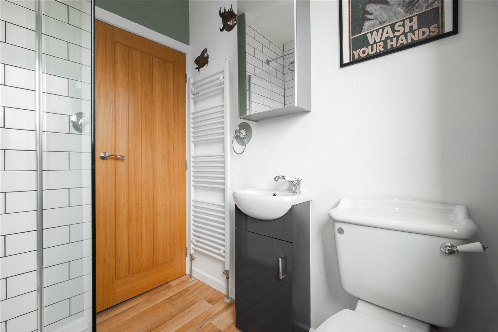 With low flush wc, vanity washbasin, heated towel rail, wooden flooring and extractor.