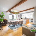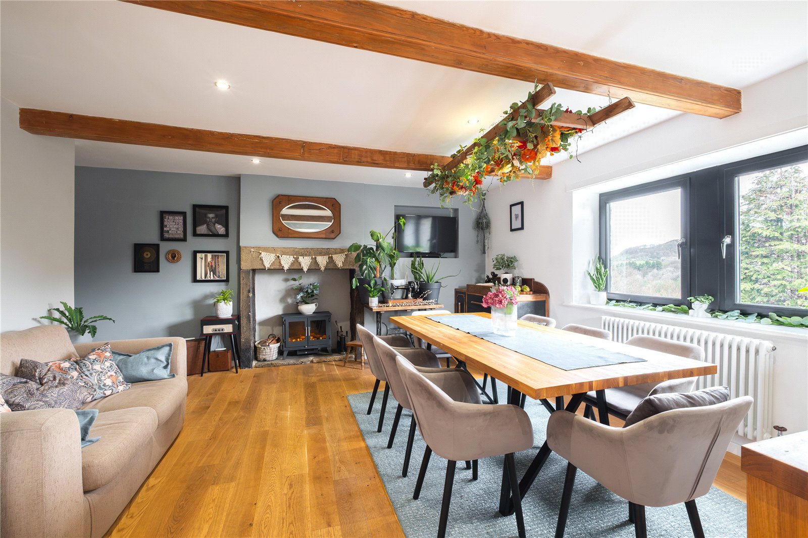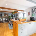 A generous living space which is in turn open plan to the kitchen area. It features tilt and turn windows to the side enjoying the stunning views, beams and inset spotlights to the ceiling, stone fireplace with electric flame effect fire, wooden floorboards, central heating radiator and a recessed bar set into an inset in the wall.