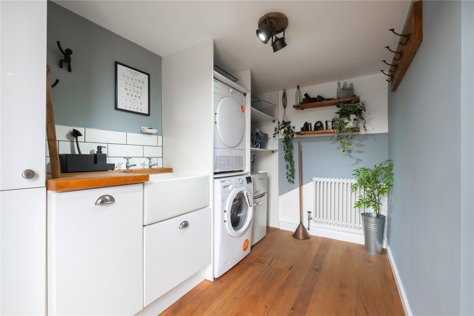 With door to the side garden area, fitted units and shelving with ceramic sink unit, plumbing for washing machine and column radiator.