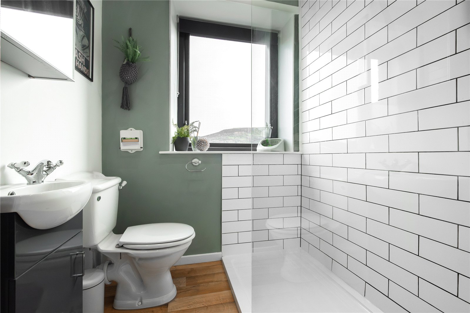 With low flush wc, vanity washbasin and walk in shower area with glazed screen, tiled splashbacks, window enjoying the views and heated towel rail.