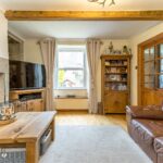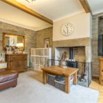 The main focal point is a gas fired stove on stone hearth set into the chimney breast. There are exposed stonework feature walls, beams, wood effect flooring, window to the front with seat beneath, and access down to a vaulted keeping cellar.