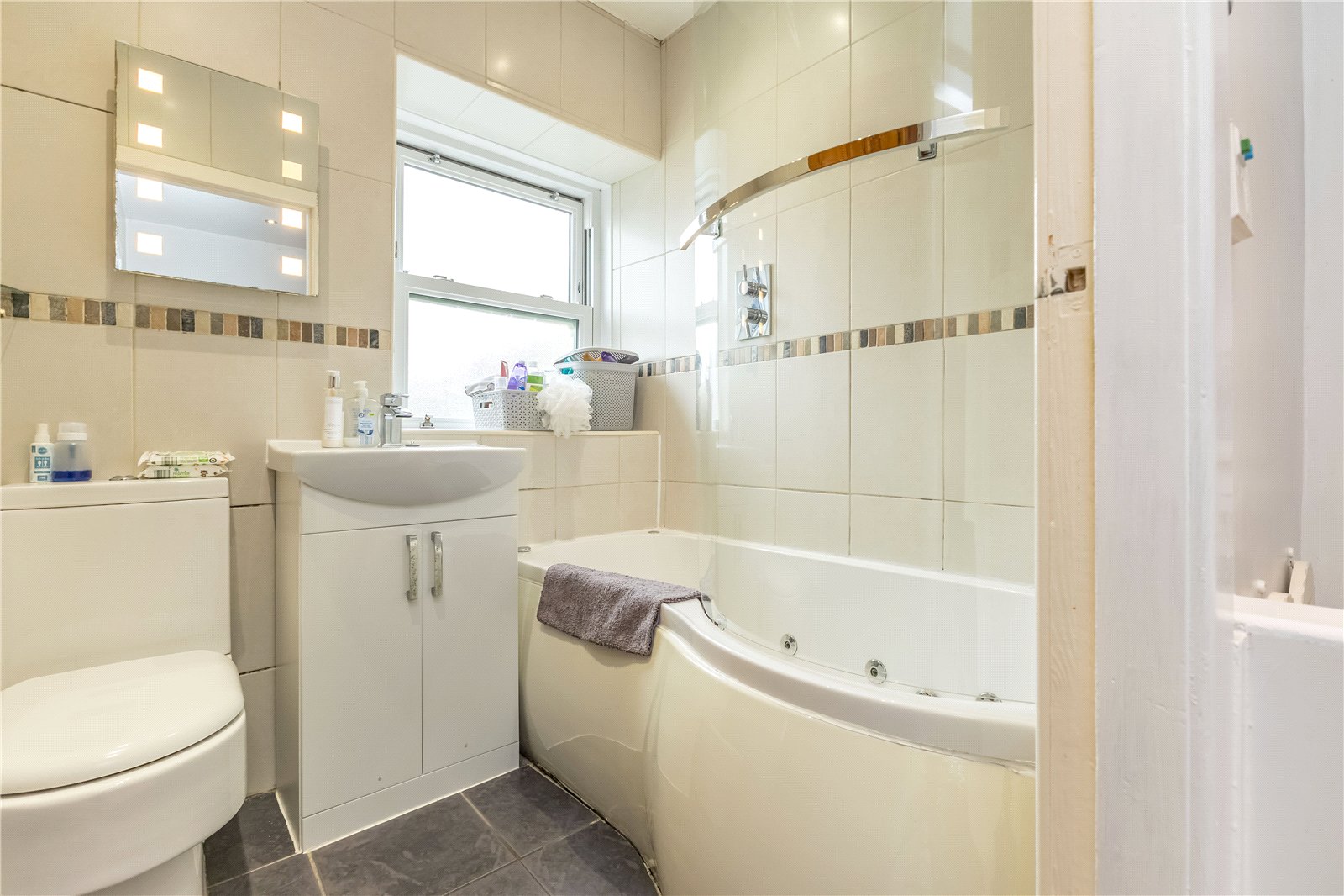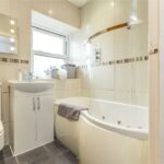 Fitted with a white suite comprising a ‘P’ shaped bath with shower and screen over, low flush w.c., and a wash basin with cupboard beneath. There are tiled walls, tiled floor, frosted window to the front, shaver socket, and a ladder style radiator/towel warmer.