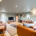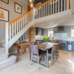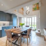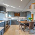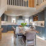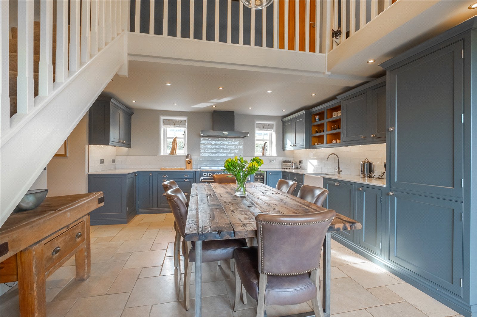 The property is entered via a central glazed door in the original barn opening to the dining kitchen. This, with additional glazing around the door provides spectacular views with the additional drama of a double height ceiling, with exposed roof trusses over part of the kitchen area. The kitchen is fitted with a good range of hand painted in frame units with granite worksurfaces and a Falcon range style cooker with induction hob.