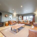 A large living room which features mullioned windows to the front enjoying the views, further side window, side and rear entrance doors, limestone tiled flooring, inset spotlights to the ceiling and Dunsley log burning stove set upon a stone hearth.