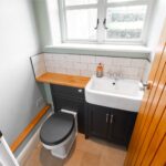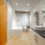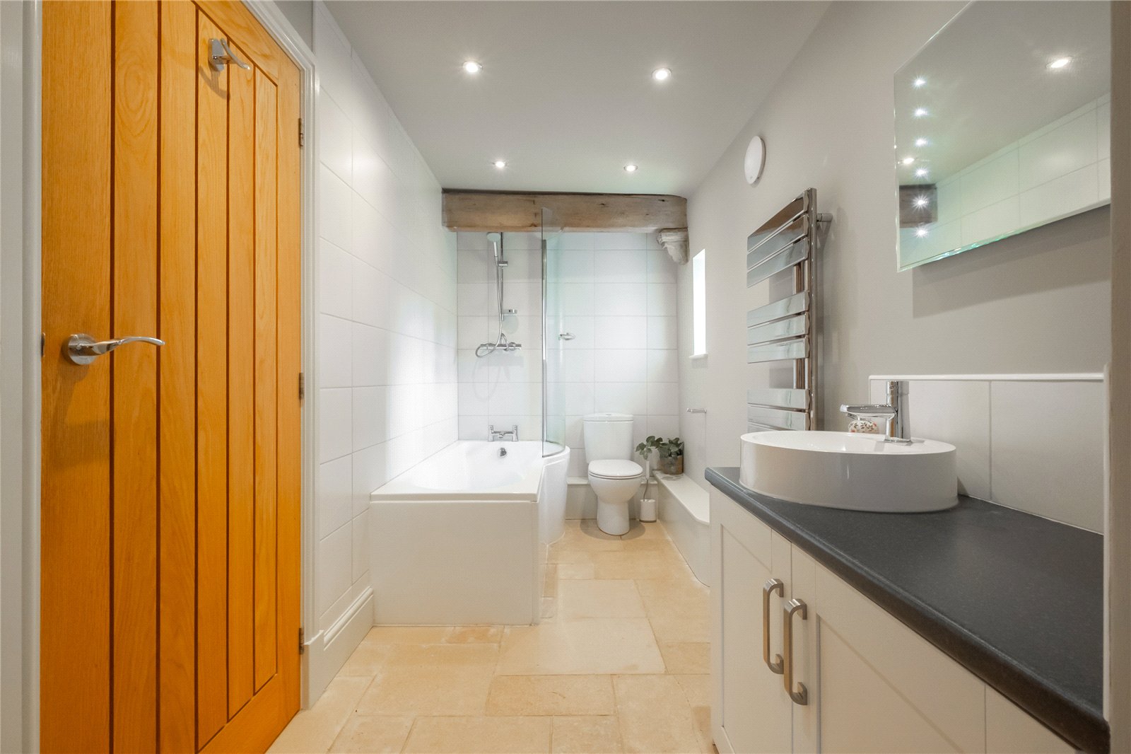 The house bathroom is also en-suite to bedroom 1. It features a low flush wc, vanity unit with washbasin, bath with shower and curved screen over, partly tiled walls, electric heated towel rail, window to the rear, limestone tiled floor, beam and spotlights to the ceiling and extractor.