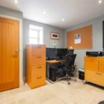 A handy downstairs study, currently used as a home office. Features a window to the front, a cupboard housing the fuse box and electrics. Limestone tiled floor.
