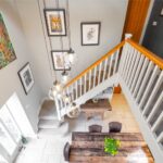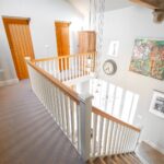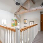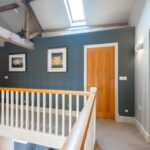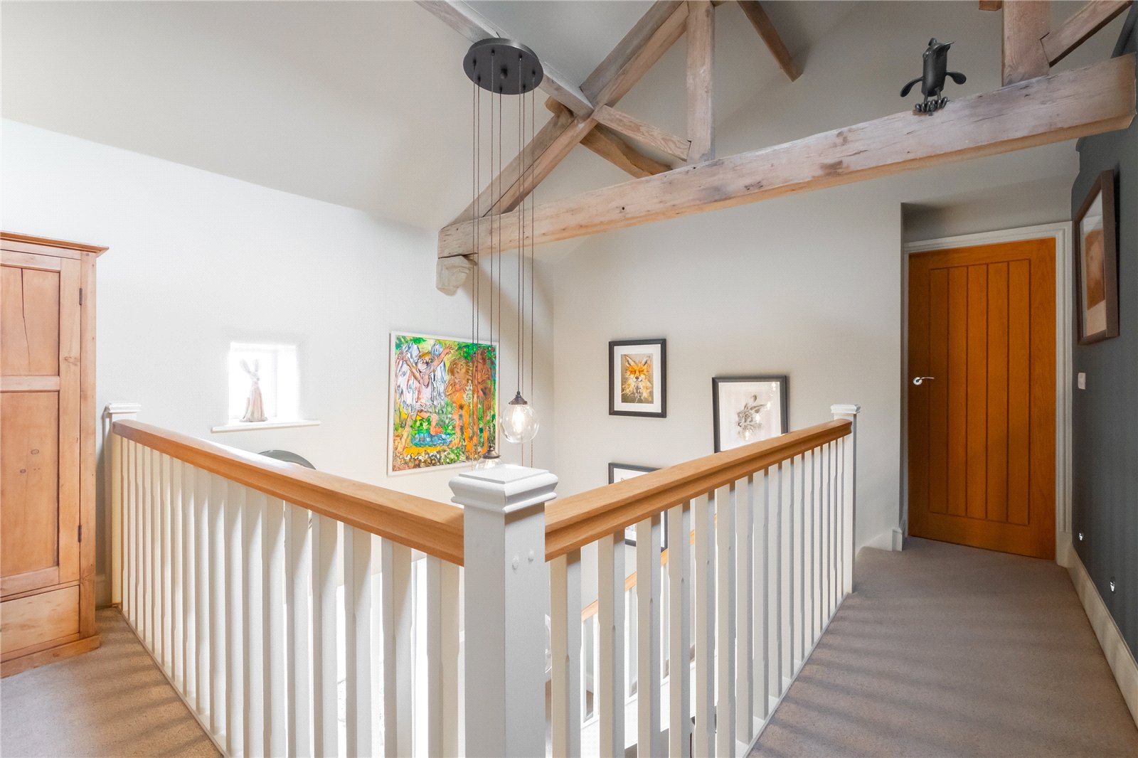 A stunning landing area which overlooks the kitchen and features exposed roof trusses to the angled ceiling above, with Velux window and a small window to the front, attractive glass pendant chandelier and low level lighting.
