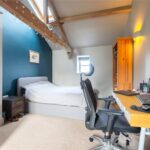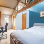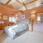 A large double bedroom with windows to side and rear, exposed roof truss to the high angled ceiling and open mezzanine loft area (above bedroom 3), underfloor heating.