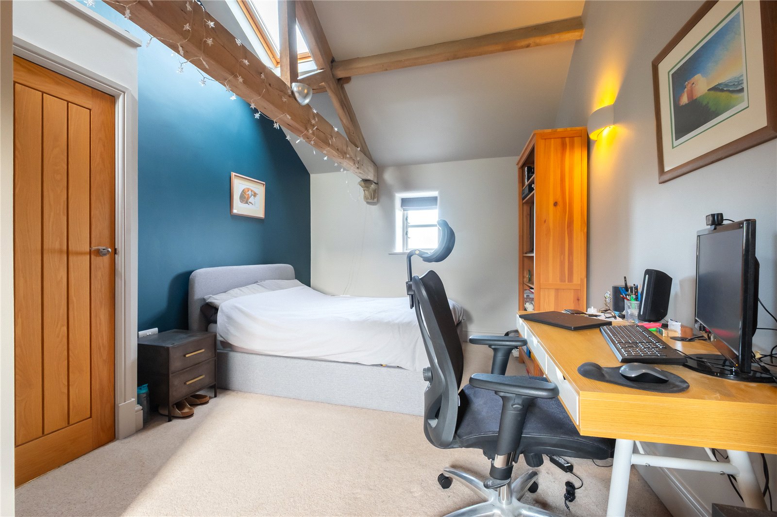 Another good sized double bedroom with windows to the front and rear enjoying the views. Exposed roof trusses, and two Velux windows in the angled ceiling and underfloor heating.