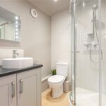 With modern suite in white comprising low flush wc, vanity washbasin and shower enclosure, limestone tiled floor, partly tiled walls and electric heated towel rail.