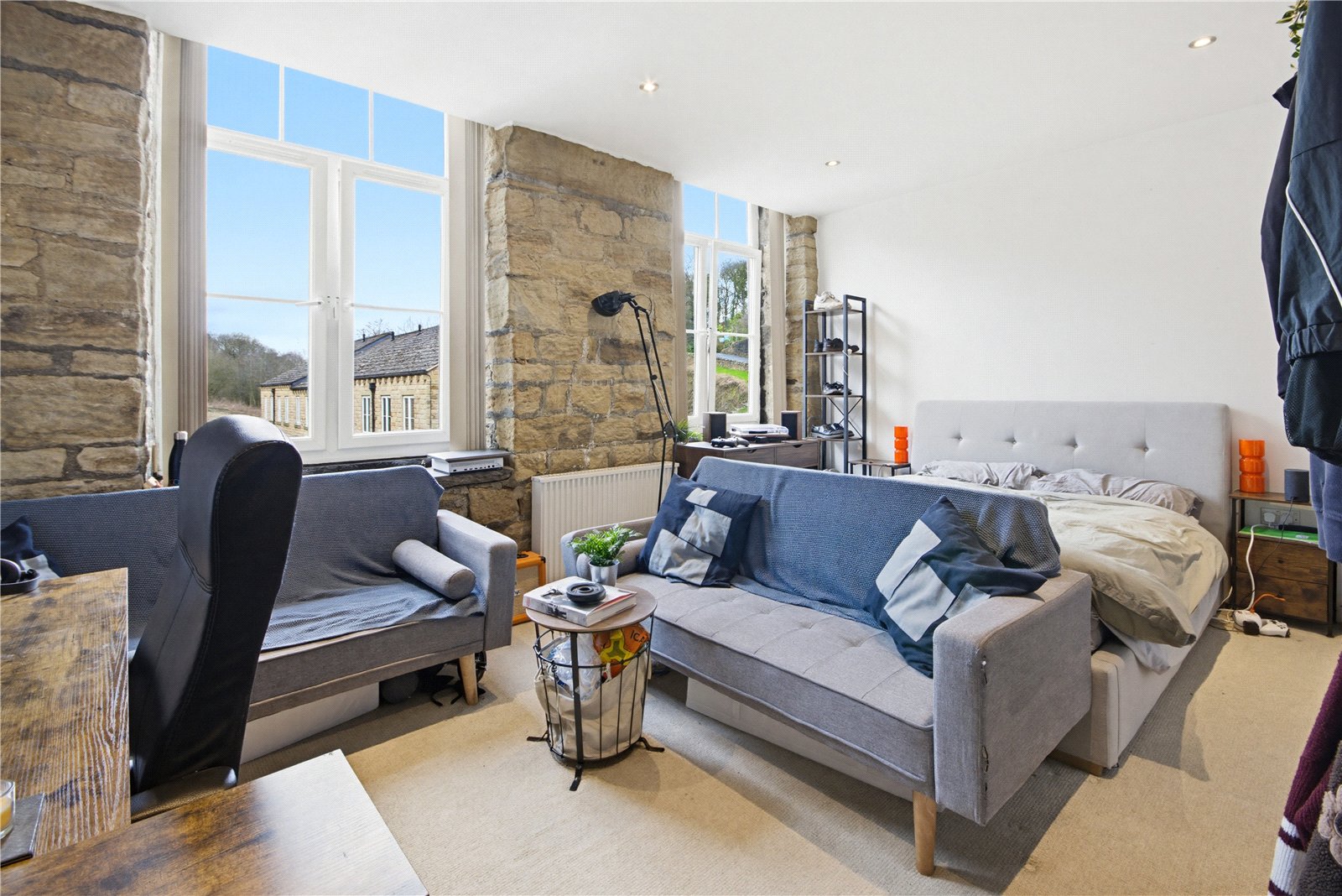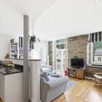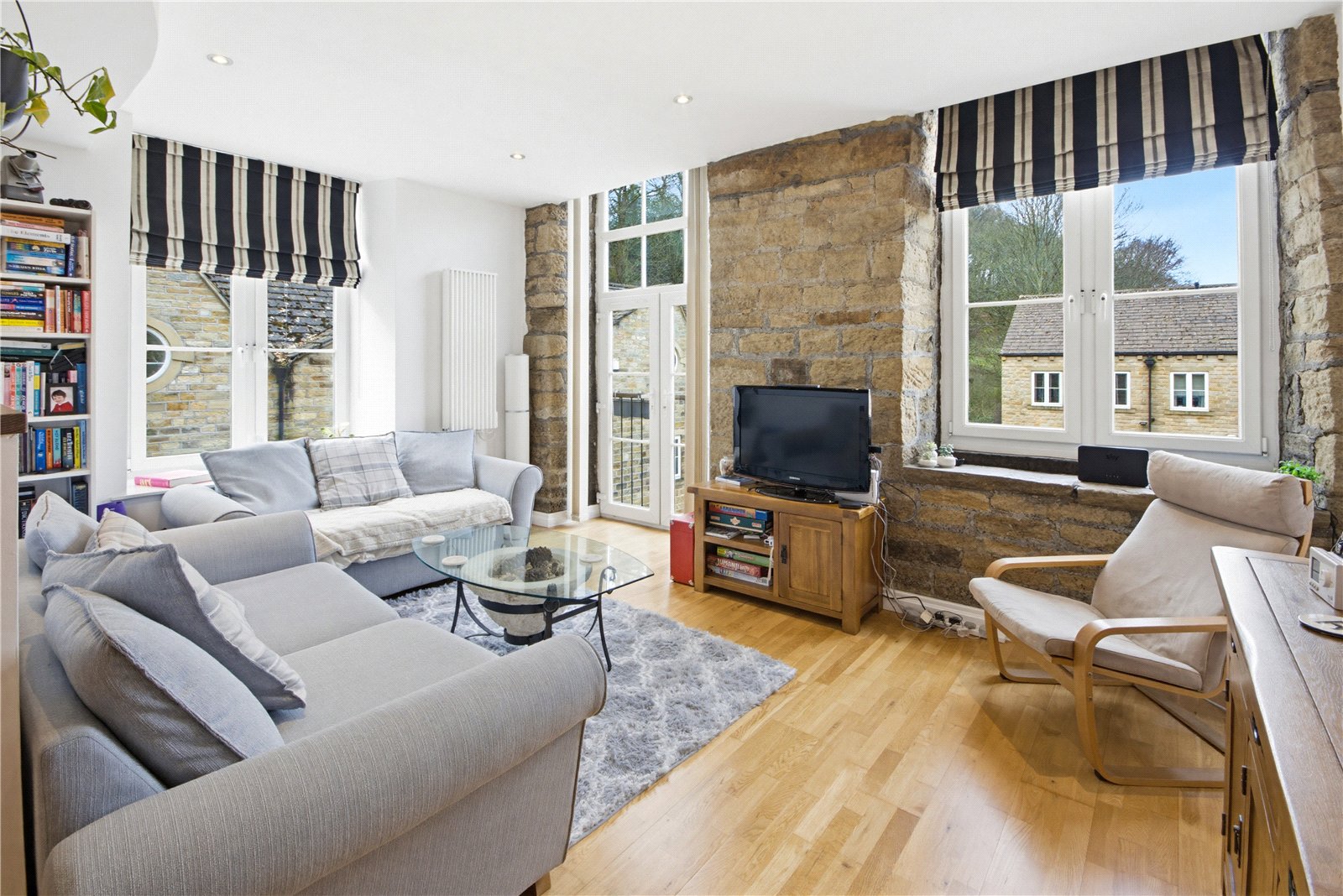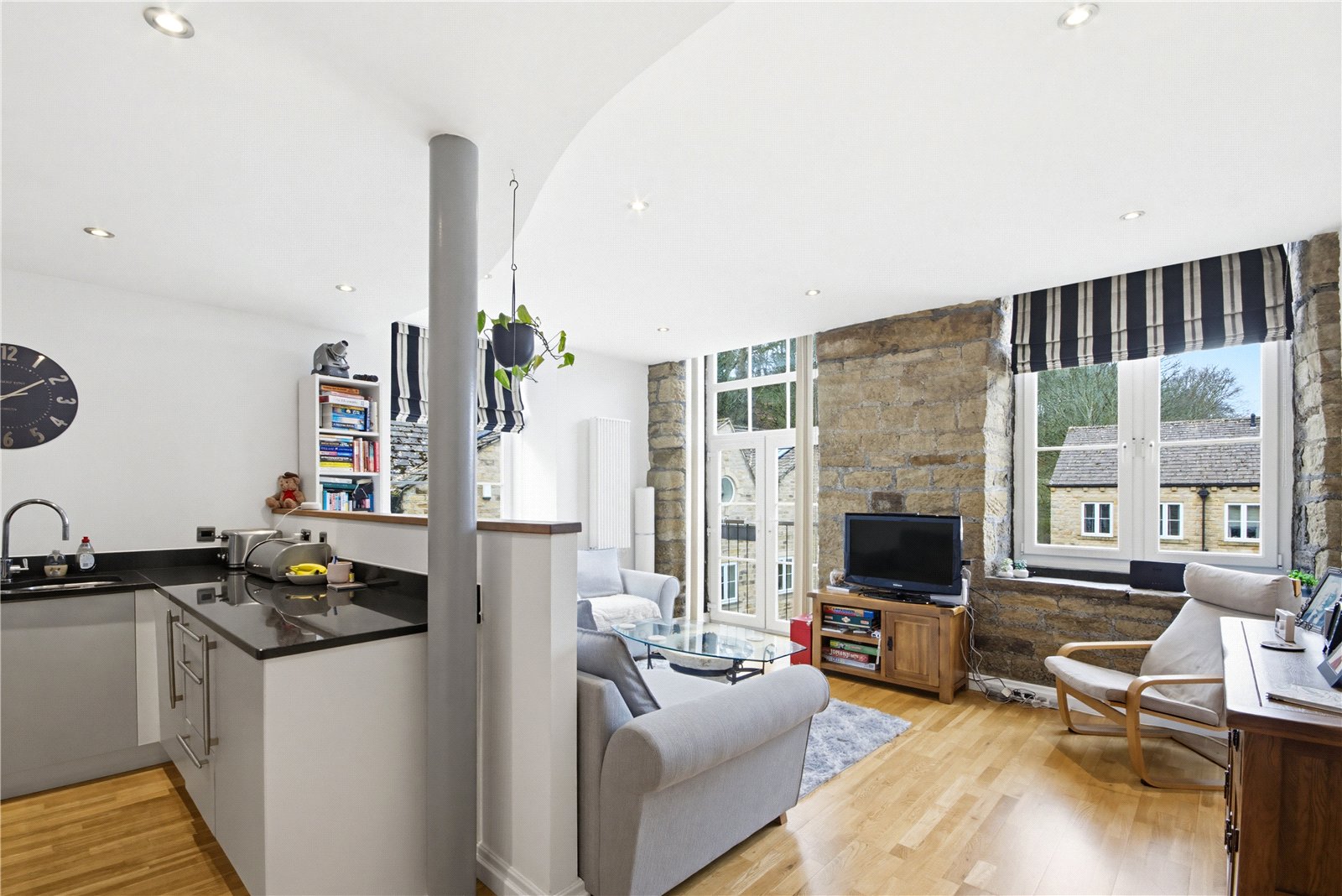 The living area features exposed stonework to 1 wall along the rear elevation where there is a window and glazed double doors to a “Juliette” balcony. A further window to the side provides additional natural light and there is engineered wood flooring, inset spotlights to the ceiling and 2 electric heaters.
