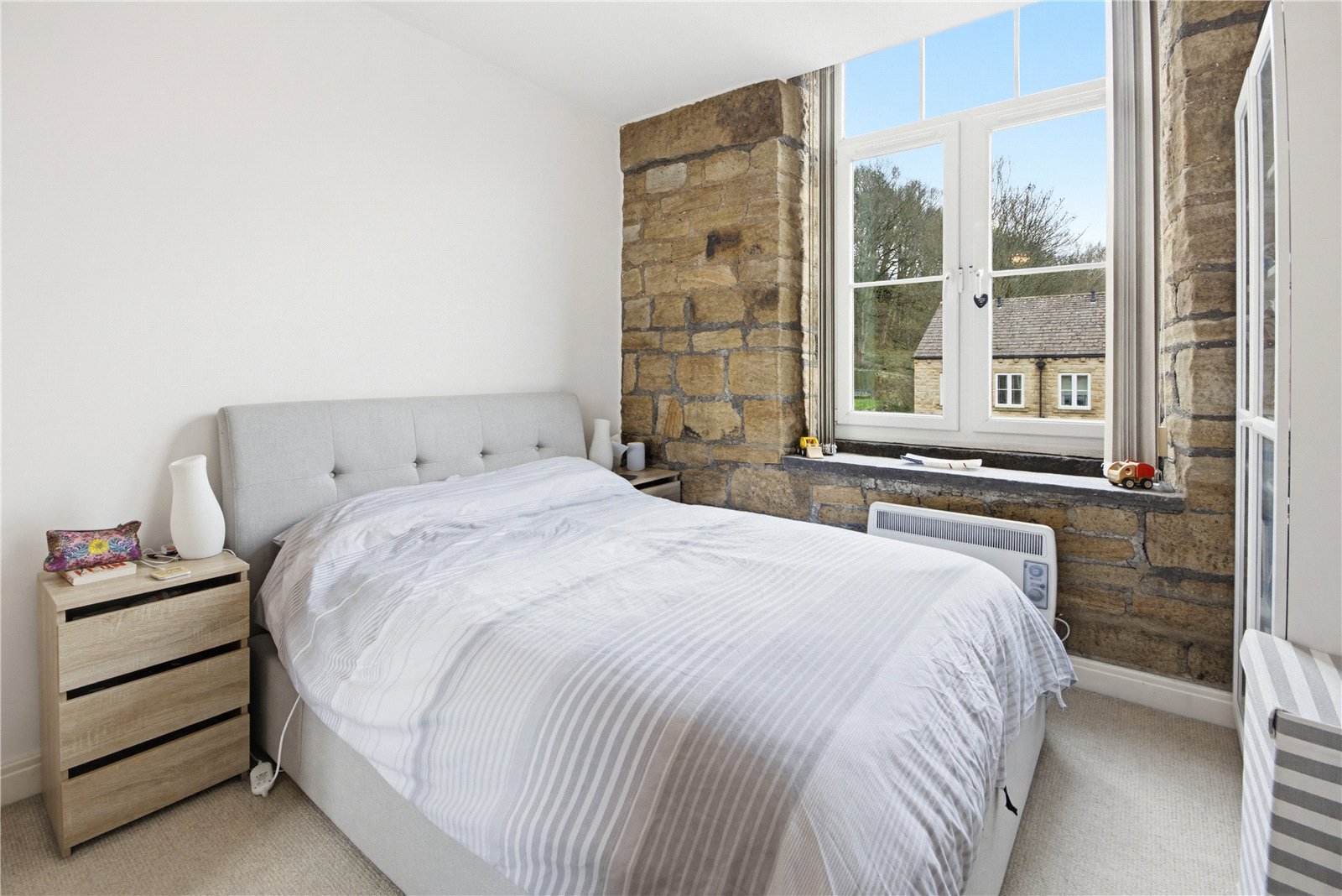 Another double bedroom with exposed stone wall and window to the rear, fitted wardrobes and electric heater.