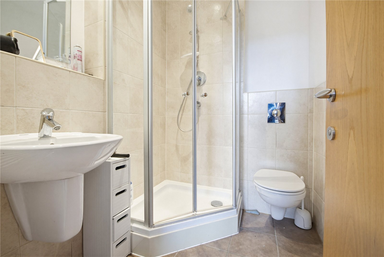 With three piece fitted suite comprising low level w.c with push button flush, a wash hand basin with chrome mixer tap and a corner step-in shower cubicle with thermostatic shower. There are part tiled walls, tiled flooring, a heated towel rail, inset spotlights to the ceiling and an extractor fan.
