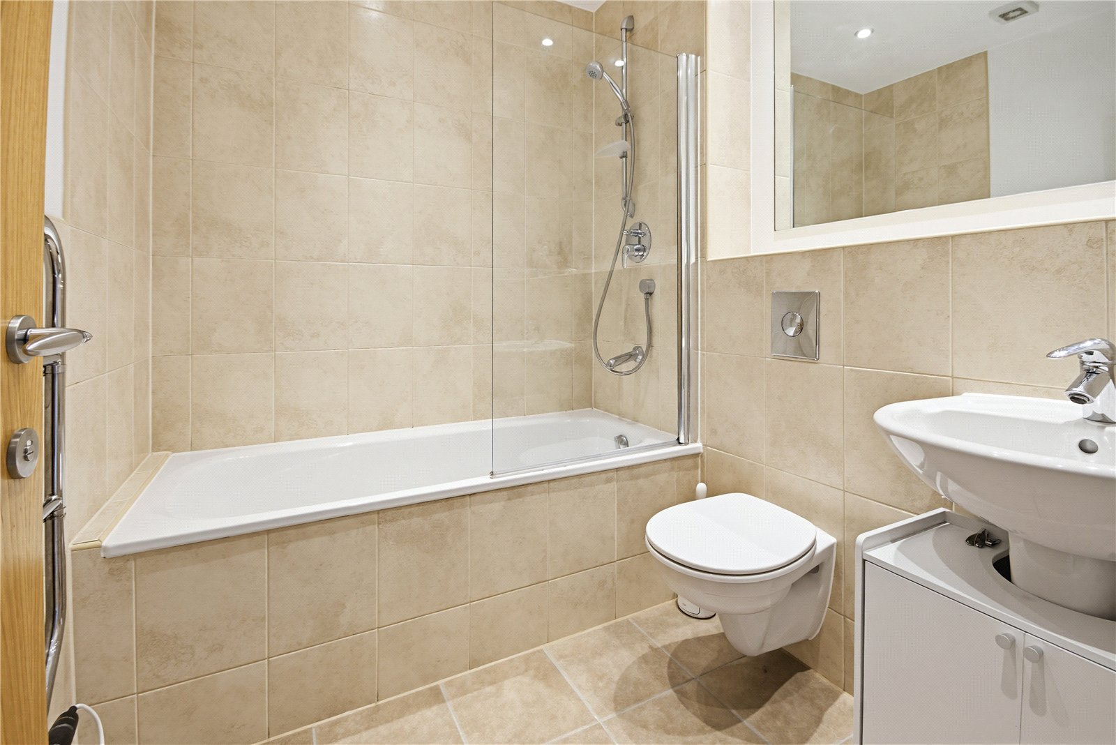 The house bathroom has a white suite comprising of inset bath with tiled surround with thermostatic shower over with adjoining shower guard, low level w.c with hidden cistern and push button flush and a wash hand basin with chrome mixer tap. There are part tiled walls, tiled flooring, chrome heated towel rail, inset spotlighting to the ceilings and extractor fan.